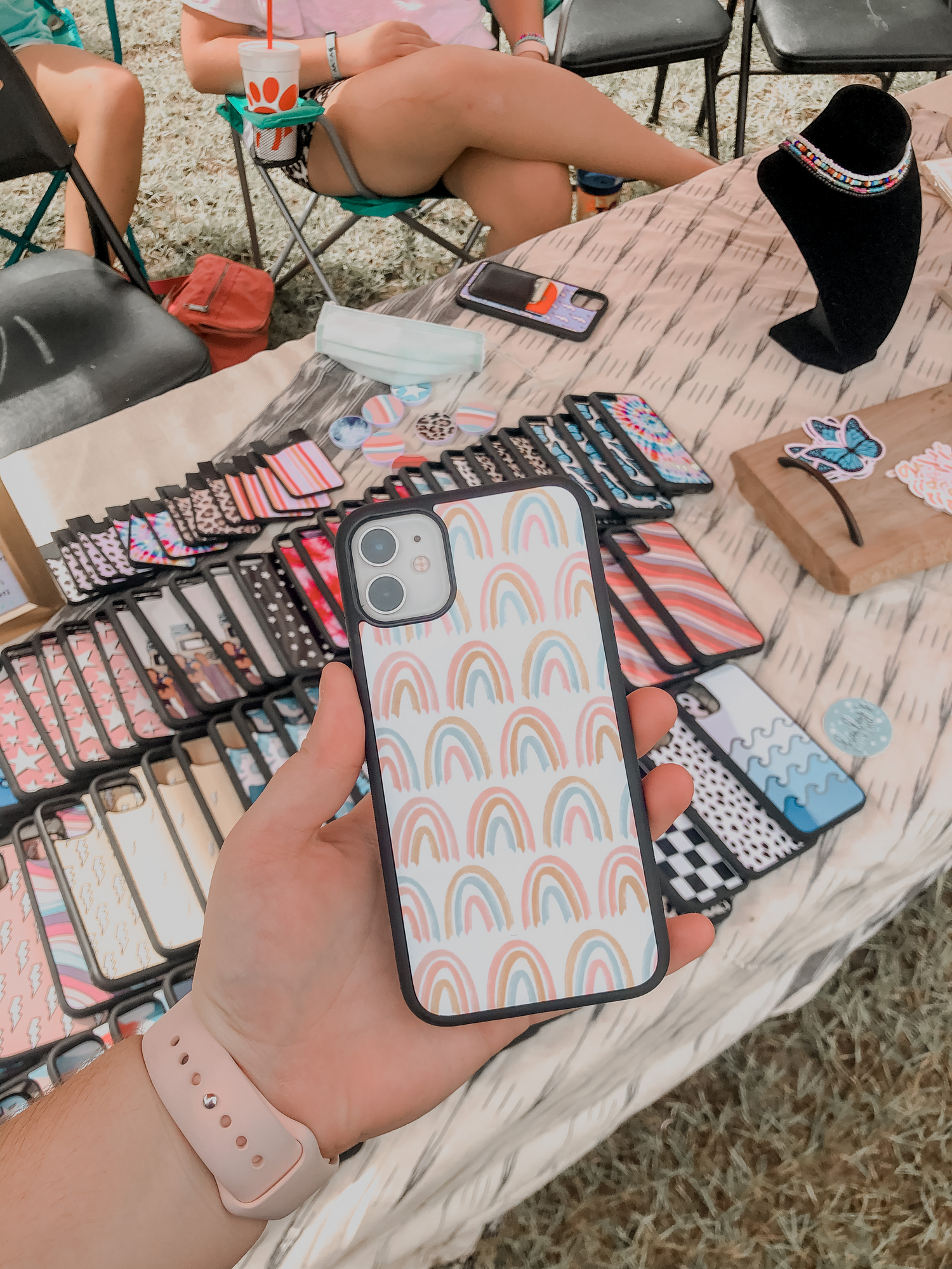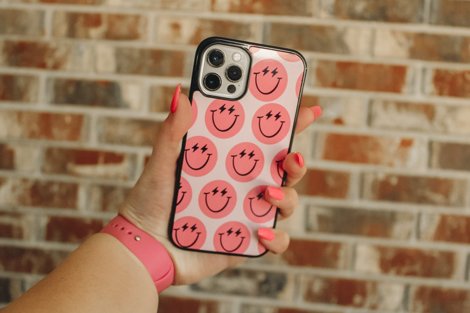 One of our bestselling phone cases, a super bright and fun pink lightning bolt smiley face case for most iPhones!